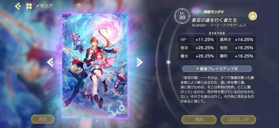SSR回憶卡「亜空の道を行く者たち」(效果為破壞者裝備時+50%破壞數值,速度最高+14.25%)