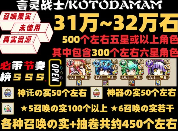 號內共500左右個五星或以上角色必帶300上下個六星角色 必帶多個言靈祭限定 即節奏榜S級或SS級角色 隨機發