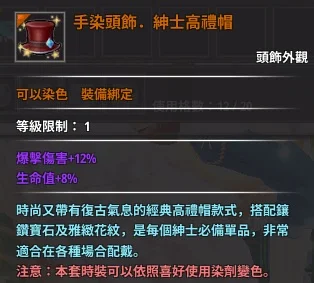 1. 手染頭飾.紳士高禮帽 爆擊傷害+12% 防禦值+5% (數量2個) | $ 319 |