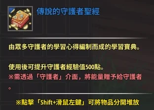6. 傳說的守護者聖經 使用後可提升 守護者經驗500點 | $ 1:4 |