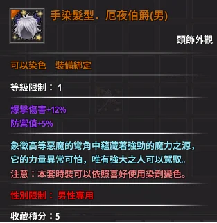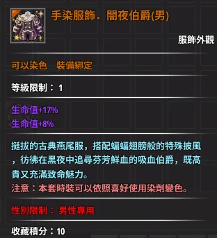 | 3. 手染頭飾.厄夜伯爵(男) 爆擊傷害+12% 生命值+17% (數量1個) 防禦值+5% (數量1個) | $ 319 |