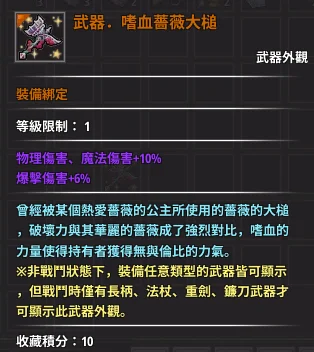 | 4. 武器.嗜血薔薇大槌 物理傷害、魔法傷害+10% 爆擊傷害+6% (數量1個) | $ 372 |