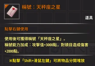 | 天秤座之星 攻擊值+3000 對頭目造成傷害+2000點 | $ 1400 |