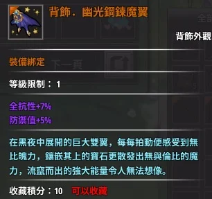 | 4. 背飾.幽光鋼練魔翼 全抗性+7% 防禦值+5% (數量3個) | $ 319 |
