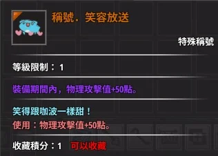 | 稱號.笑容放送 裝備期間內, 物理攻擊值+50點 | $ 50 |