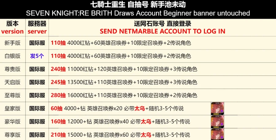白銀版 (發五組) | 110抽4000紅鑽石+60英雄召喚券+10限定召喚券+2傳說角色 | 700 |