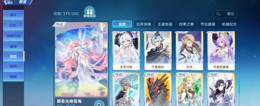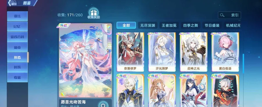 帳號帶有花嫁主題頁面(共三個),圖鑑僅缺漆漆與面具人,屬於當週號;體系隊全王專,本週活動已拉滿,每週進度持續更新。光啟圖鑑接近全收集,王專率達 80%,基本所有光啟寵均有專屬;常用輔助及打手基本配備 2-3 套以上配置,且幾乎所有光燼打手均為全專屬(含所有群星基礎配置)。