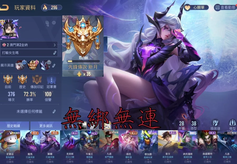 【G帳無綁無連、先鋒傳說·新月、V1、28英、38造】無綁無連現35星 紫標光頭 藍標蘇黎 兔羅 深淵 理想國 厄災 足球 皇帝 傳說