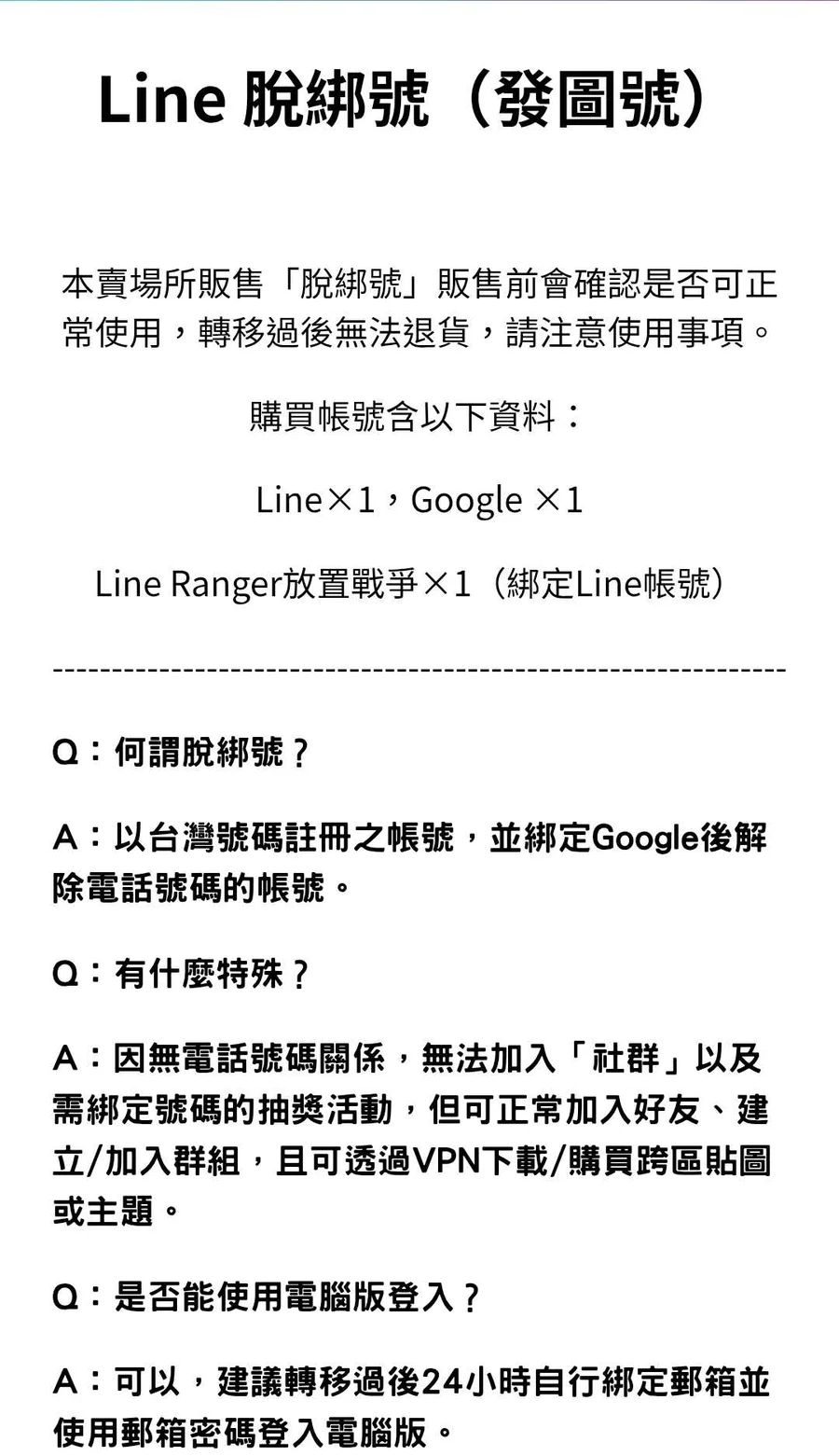 Line 新號/脫綁號/發貼圖專用號 google登入 已綁定google帳號 無手機綁定,無社群功能,其他功能正常 可直接VPN 購買他國貼圖主題 價格浮動,請私訊詢價,下單視同已閱讀圖片內容,請遵守使用方式。