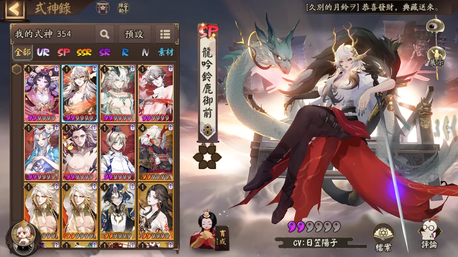 ✓5. SP夢引蝴蝶精+龍吟鈴鹿御前+心友犬神+尋森小鹿男X2+縛骨清姬+修羅鬼童丸+鬼王酒吞童子+少羽大天狗+SSR平將門X2+貓川+龍珏+千姬+鈴彥姬+緣結神+緊那羅+玉藻前+荒川之主+茨木童子+黑蛋6 --- 1150T ---