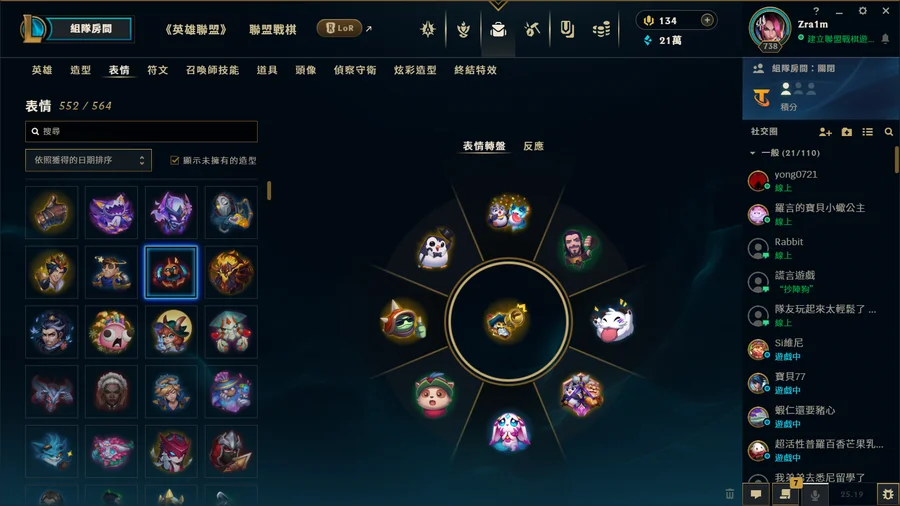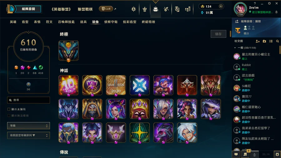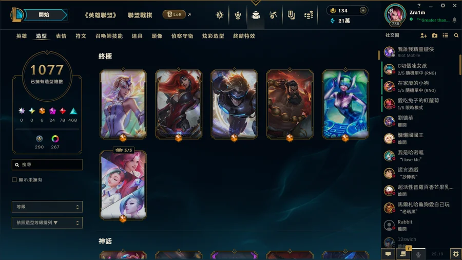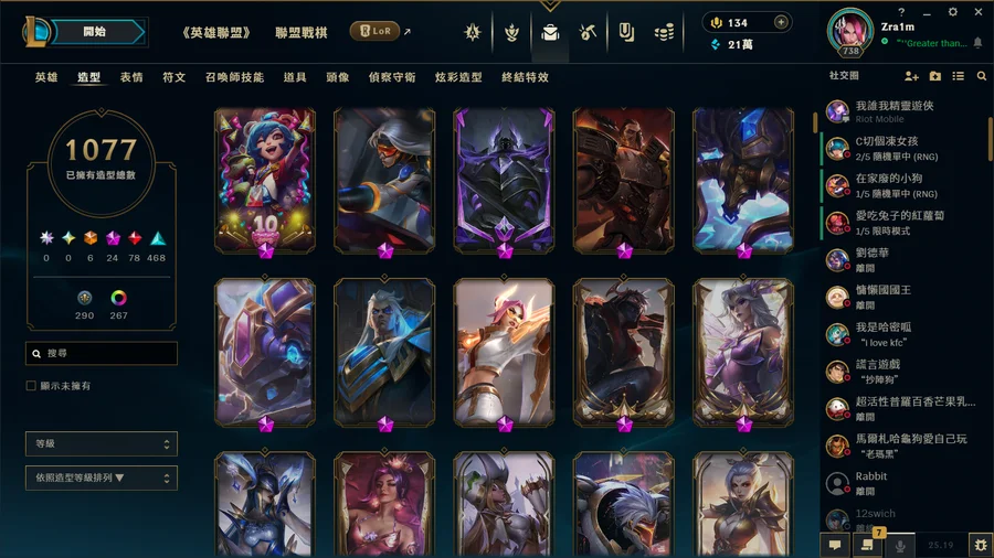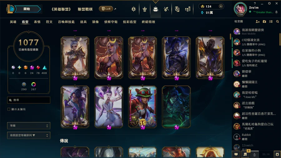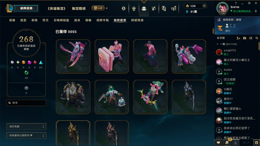 從小6玩到大三的帳號 想詳細看造型可以加dc zra1m 戰棋上季結算菁英 現在宗師全角色 基本上每個角色都一定有skin 炫彩也超級多 ad support main ad support skin最多 戰棋還有9個古幣能抽到10個古幣換保底 我有留 給有心人抽 詳細資訊可以私訊問我