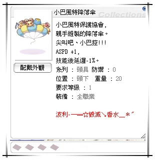 ---如圖,巴基利伺服器---此單為+22 幻影太久套(一套不拆.劍+靴)= 500T另有劍士頭盔(盧恩頭中石)= 200T+25 影子火氣息套 = 500T+19 影子冷氣息套 = 600T小巴降落傘(裝備)= 250T高精煉!超頂附魔!站著爽爽噴!賣場內另有許多便宜裝備歡迎參觀選購