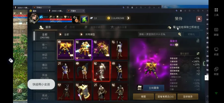 90級聖劍金技4紫技紅技滿七彩爆擊+阿頓覺醒+獨角獸覺醒+兩紫聖物對應職業名譽幣近800萬新增紫娃約尼爾覺醒紫變新增阿頓重覆1多貝里斯實收2萬