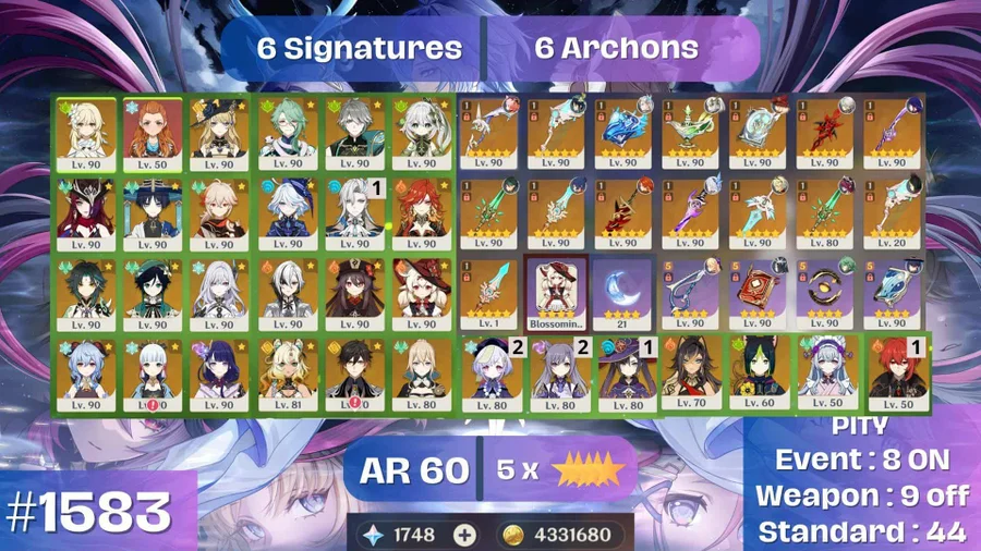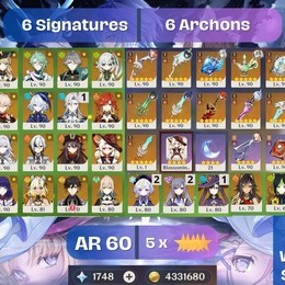 【女、60等、36金角、15金武】⭐時裝可莉+僕人+1命水龍+魈+雷草神皆專武_絲柯克_甘雨_綾華_夢見月_白朮