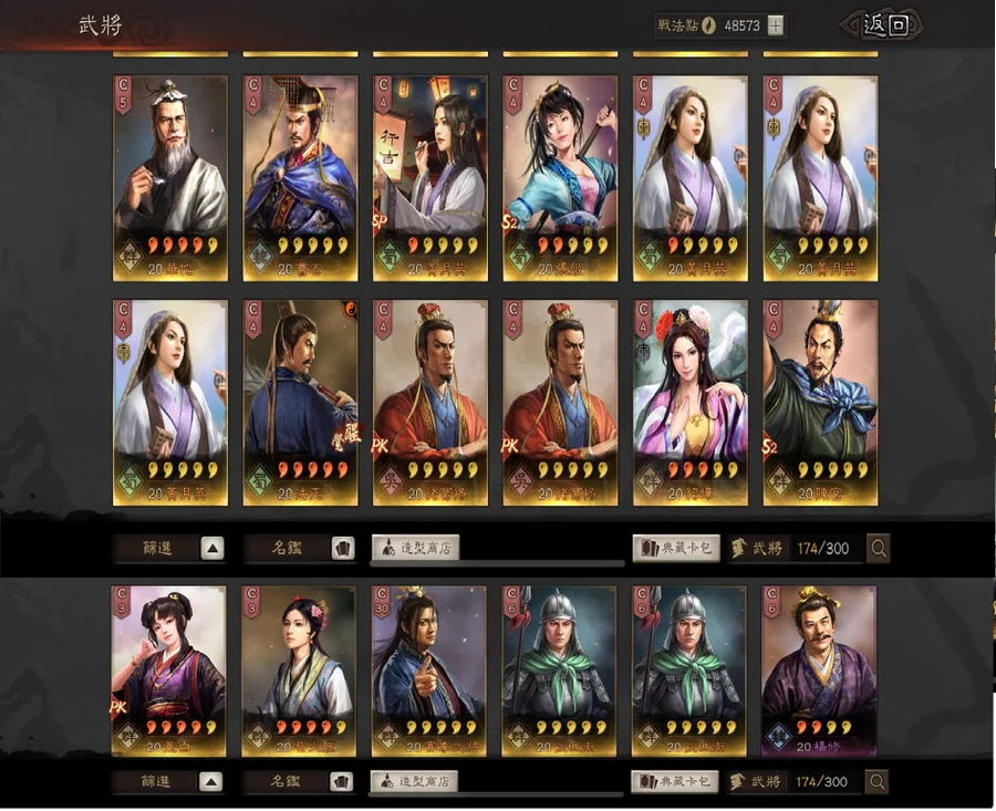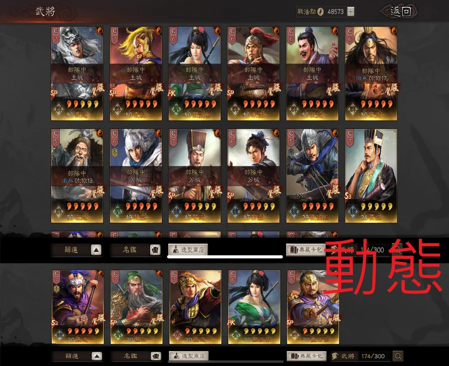 裝備:天公、號令、昭烈、無雙、2武聖、妖氣、3沈重、1靈動、1援助、1踩踏、衝陣、迅疾、忠誠 還有很多其他特技