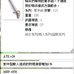 排名三強騎兵之劍 ATK+24 MHP+958 中型1% 無視不死24%