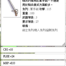 排名三強騎兵之劍 MHP+833 FLEE+24 CRI+10