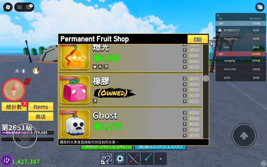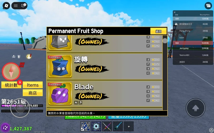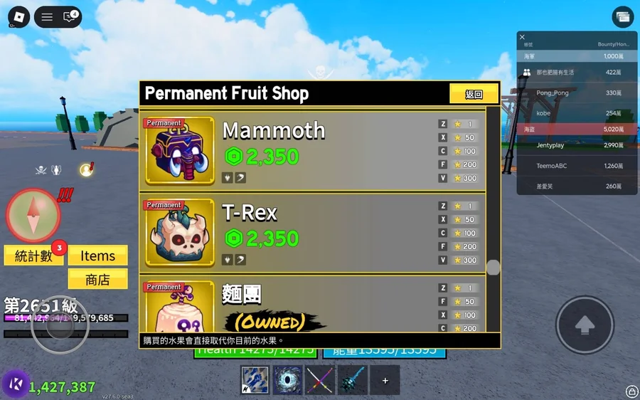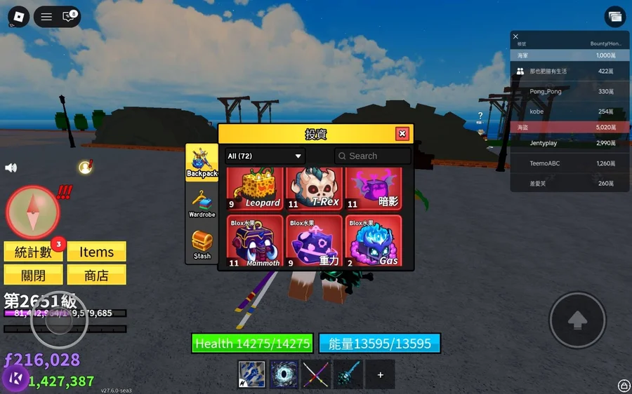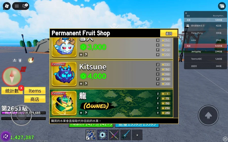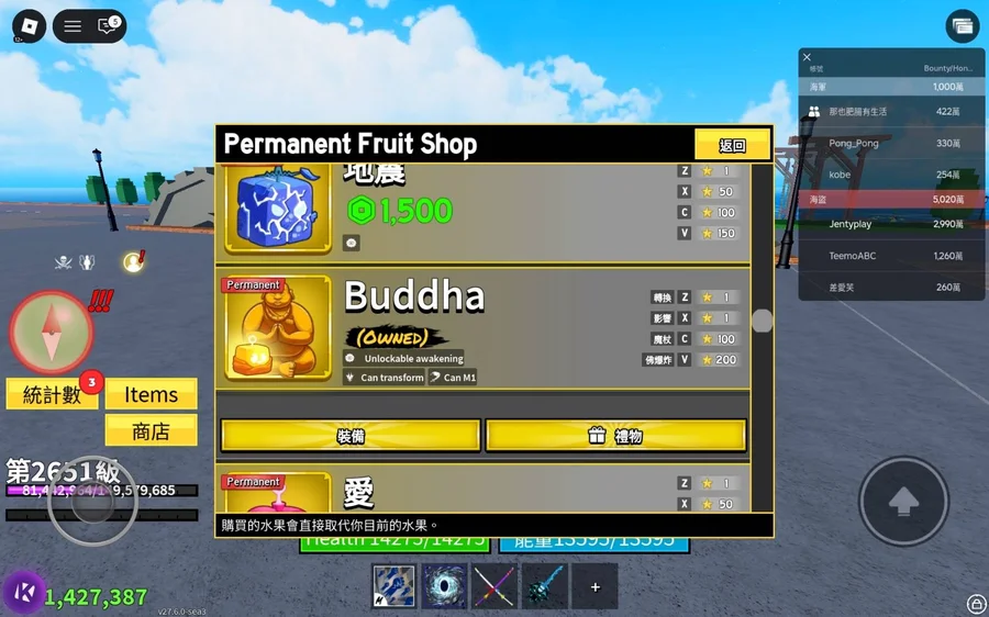 Blox fruits 2650等有永龍諾門佛火箭旋轉砍滿賞龍族漁人天使都滿齒果倉十 除了果探以外其他通行證都有,全部拳法都有