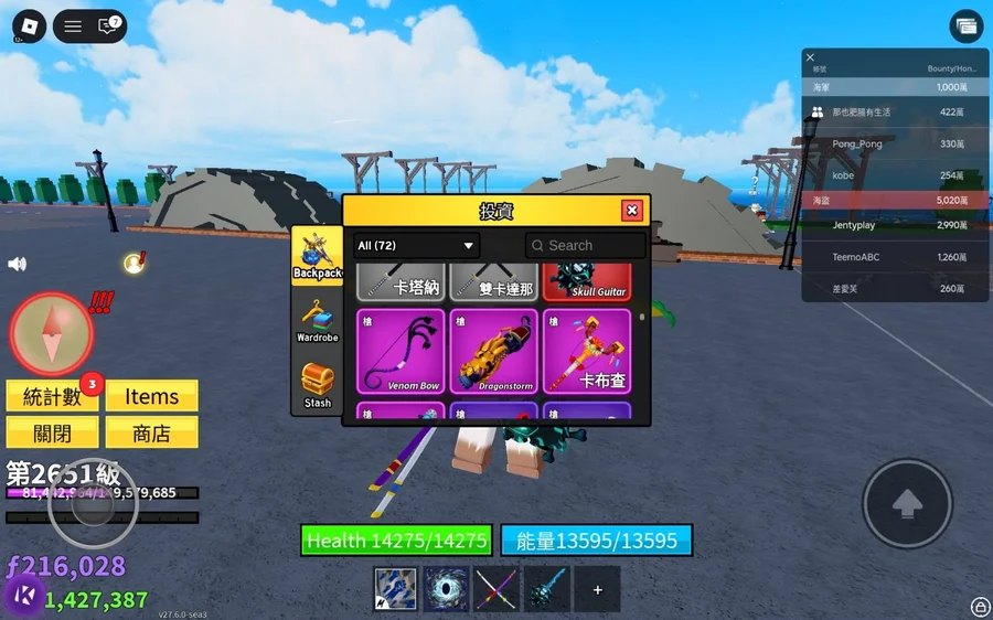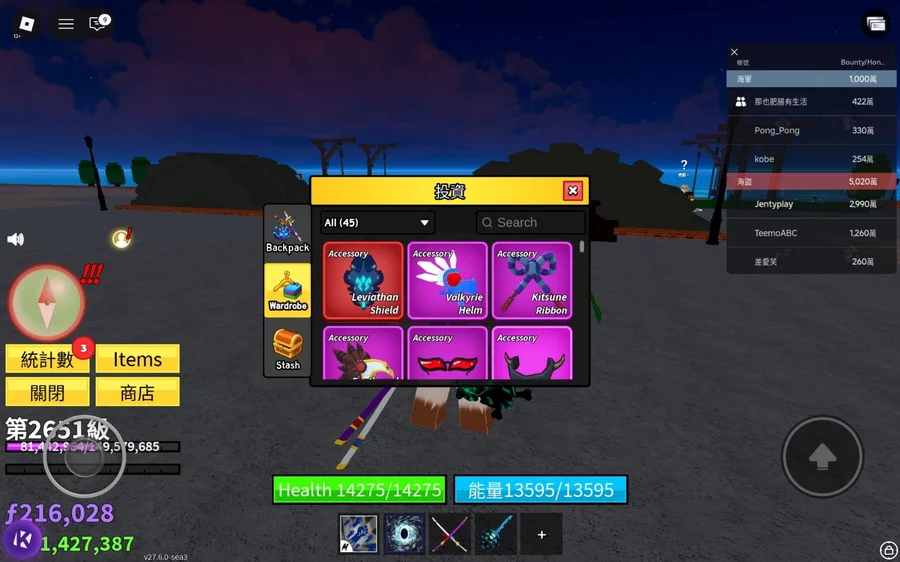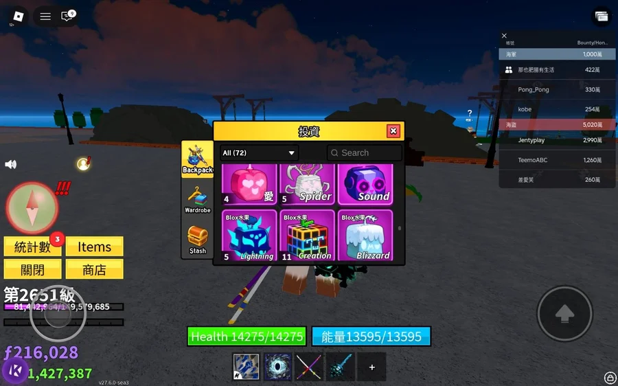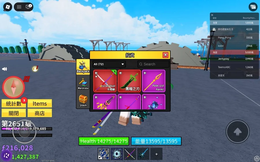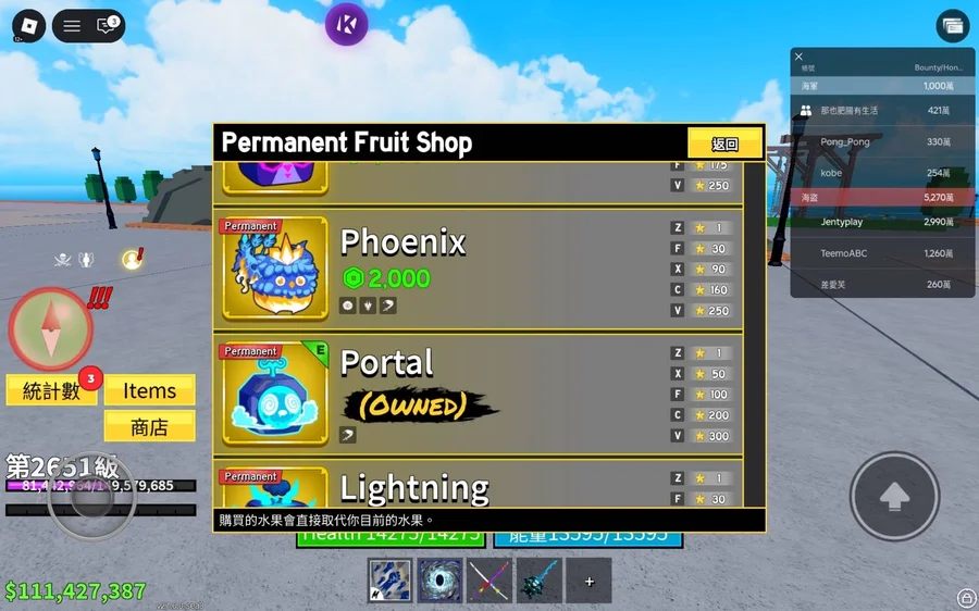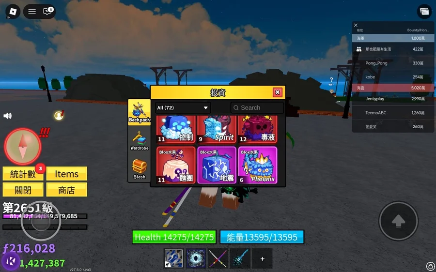 Blox fruits 2650等有永龍諾門佛火箭旋轉砍滿賞龍族漁人天使都滿齒果倉十 除了果探以外其他通行證都有,全部拳法都有