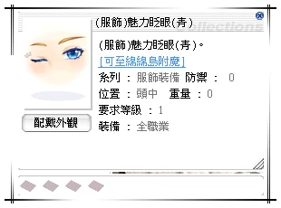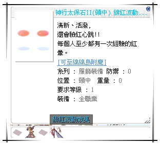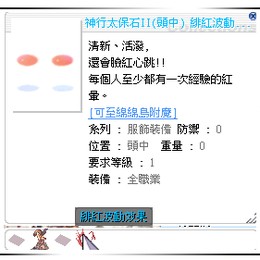 ---如圖,巴基利伺服器---此單為初戀紅暈(緋紅波動)= 100T另有夢羅克僕人(緋紅波動)= 100T繁星點點 = 100T巨人頭盔(十字II.山茶花效果)= 150T魅力眨眼 = 170T魅力眨眼(青) = 200T賣場內另有許多便宜裝備歡迎參觀選購