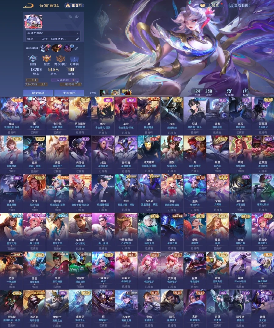 歷史璀璨傳說印記!!全英雄三百多造型!共124英雄358造型!勝率近52%!!共12次S戰場傳說印記!!常用奧義皆已齊全!!多課金抽獎造型!