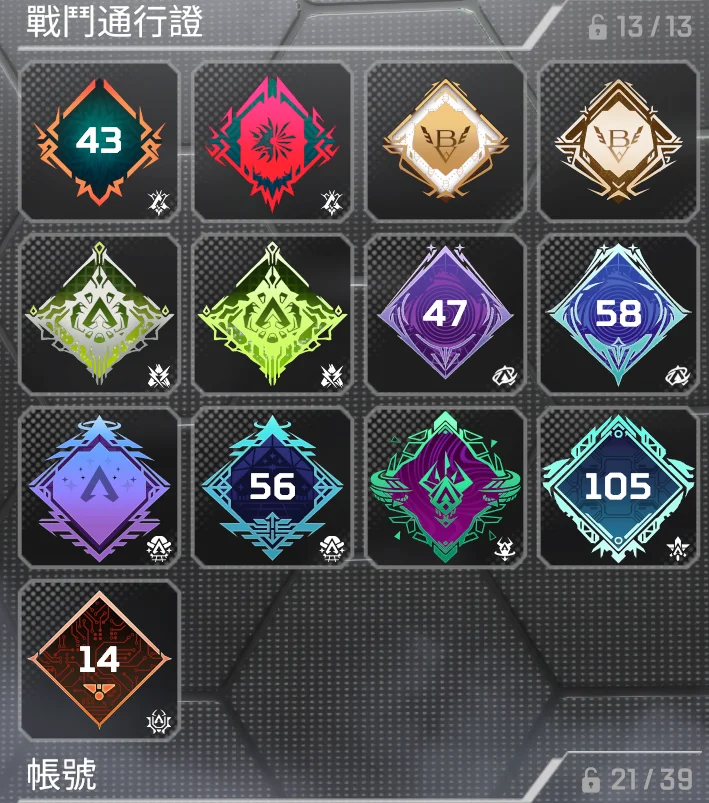 通行證24.25上下 22下 26上(下已買 目前51等)21季 20季105等 183金 目前鑽四