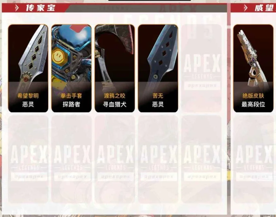 4傳家寶 326金,賽季滿級:S15賽季,S16賽季,S17賽季,S18賽季,S19賽季,S20賽季;傳家寶:惡靈-希望黎明,探路者-拳擊手套,尋血獵犬-渡鴉之咬,惡靈-苦無,稀有皮膚:最高段位
