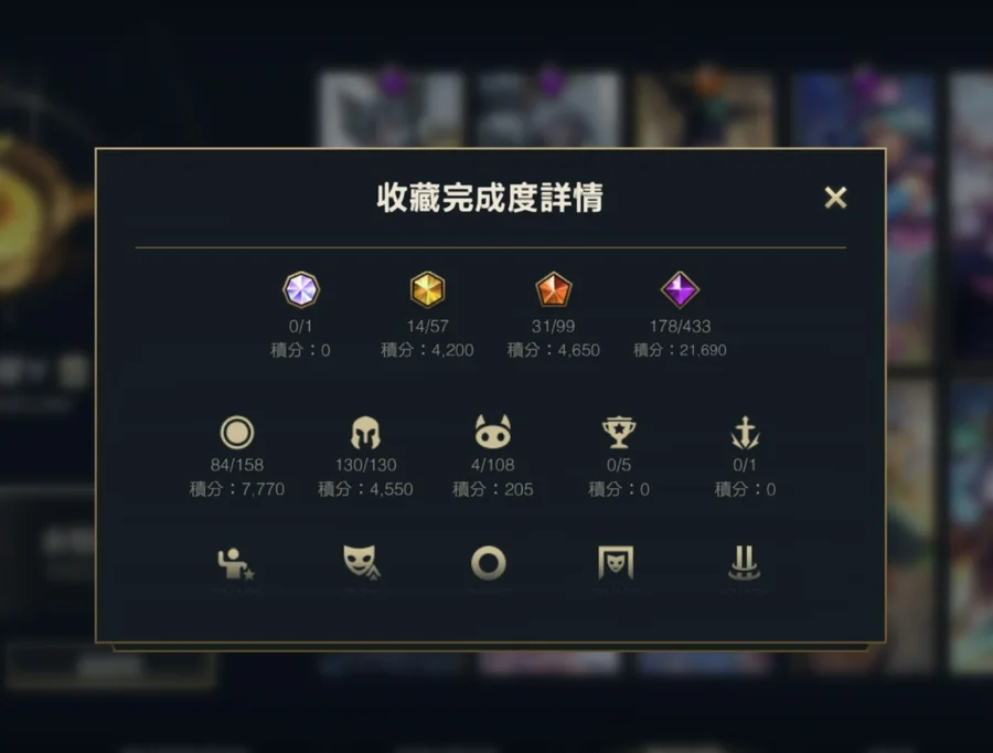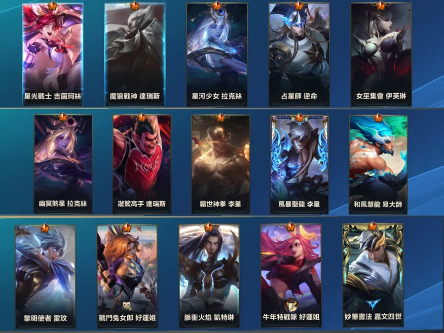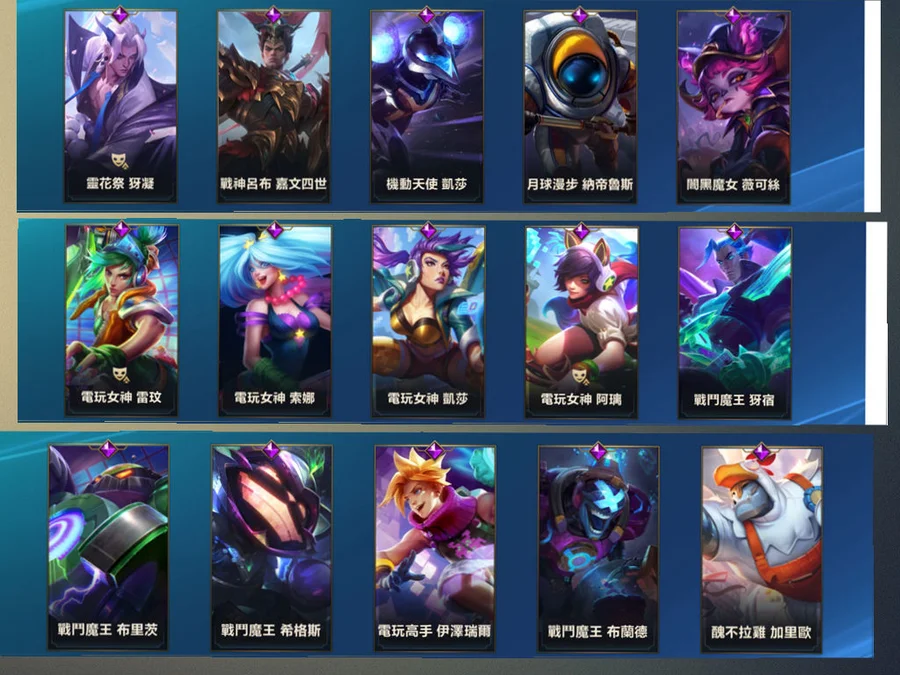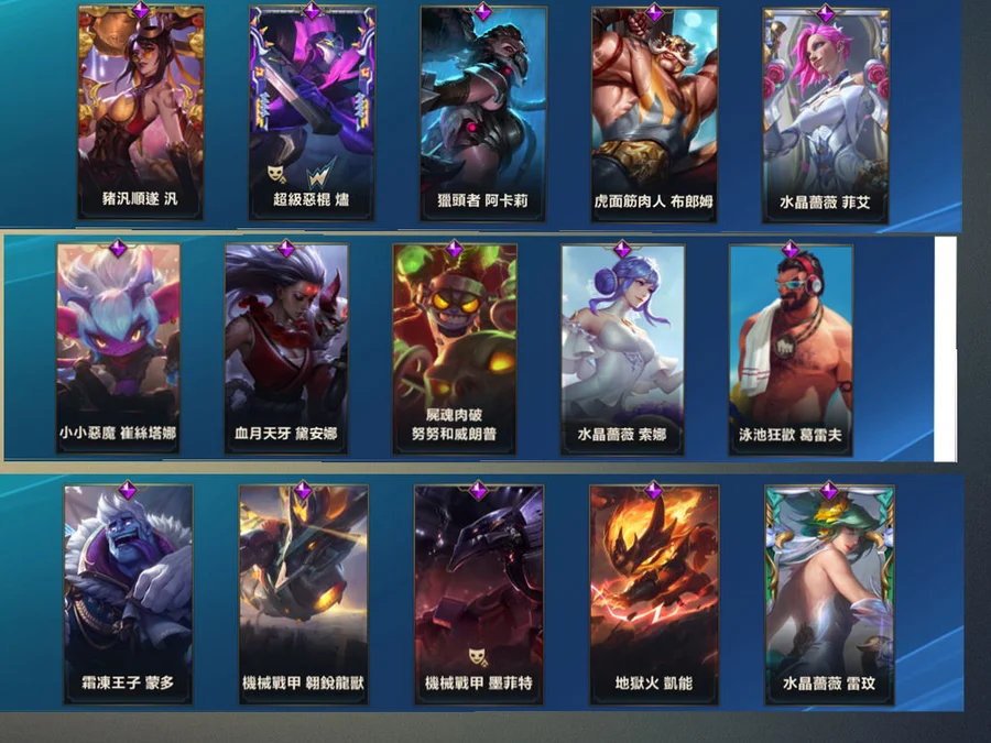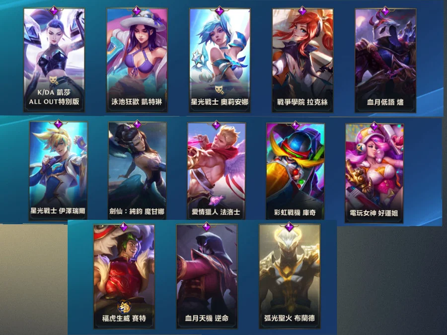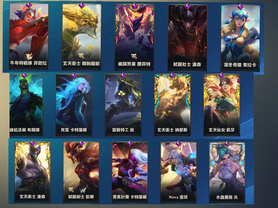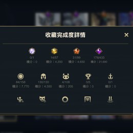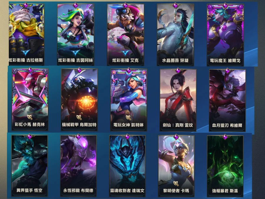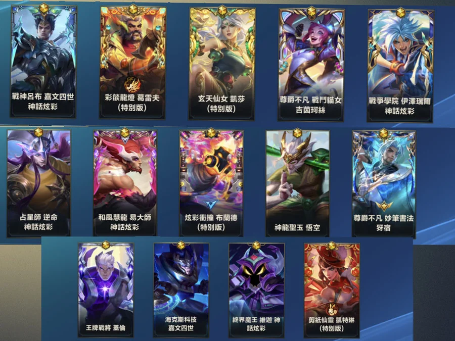 目前有全英雄 神話造型:14 傳說造型:31 史詩造型:178 一般造型:84