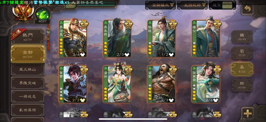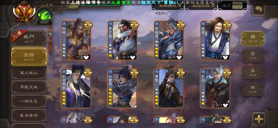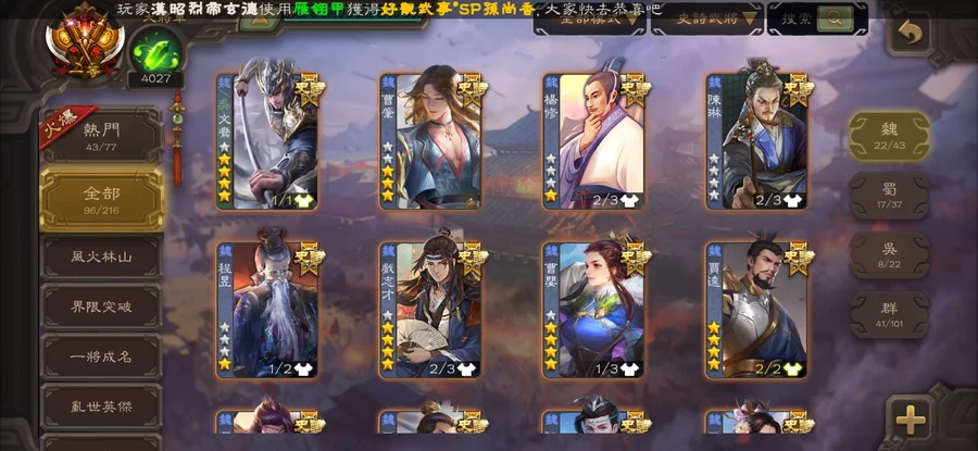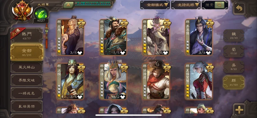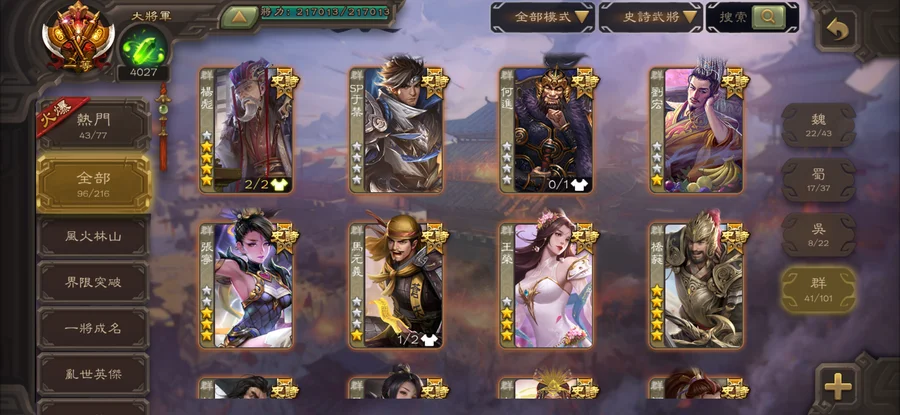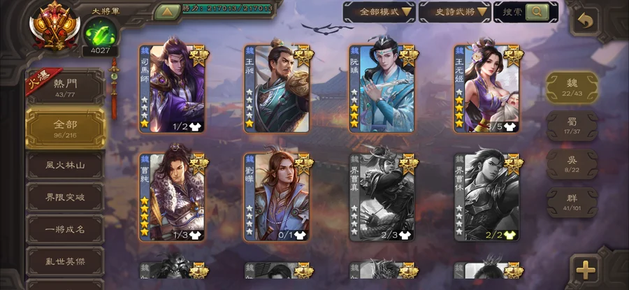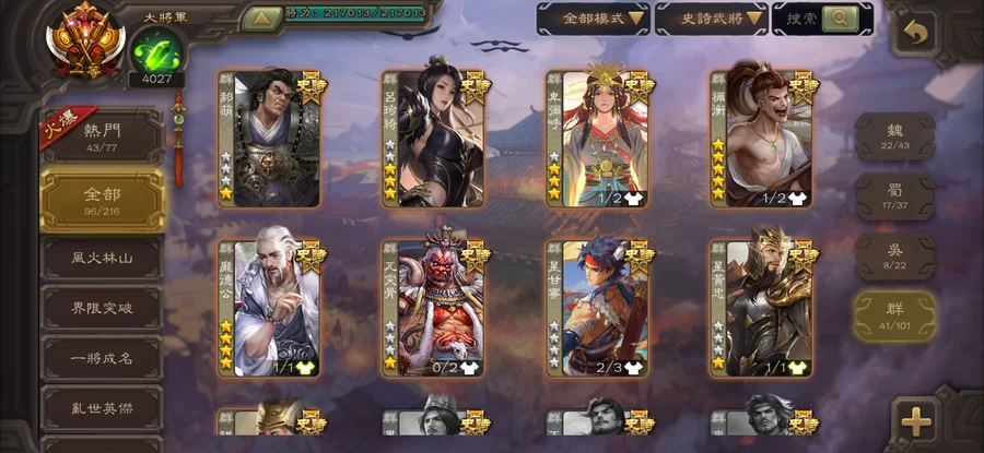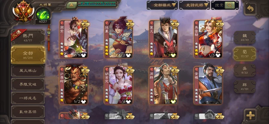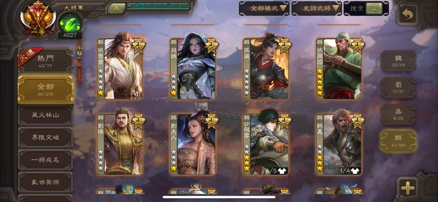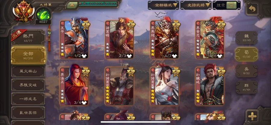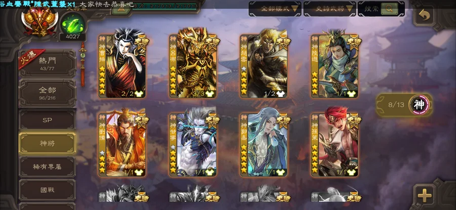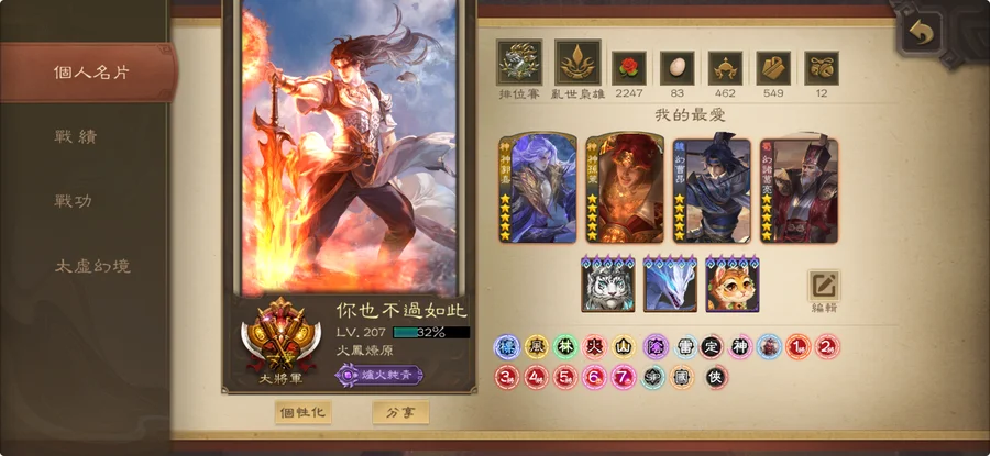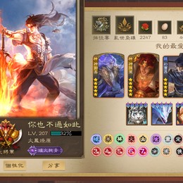 一手用心經營帳號,實力與娛樂武將兼具另有無數有價動皮(繪卷、九星大獎等),因本人特愛收集造型所故;史詩侍靈兩隻並有快6000侍魂,下隻史詩寵任君挑選;剩餘寶珠44顆與六千多元寶