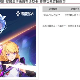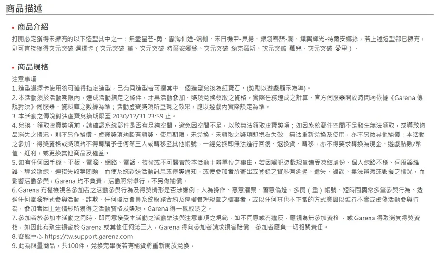 打開必定獲得未擁有的以下造型其中之一:無盡星芒-勇、雲海仙途-颯枷、末日機甲-貝揚、銀翎春語-瀾、熾翼輝光-特爾安娜絲,若上述造型都已擁有,則可直接獲得次元突破 選擇卡(次元突破-堇、次元突破-特爾安娜絲、次元突破-納克羅斯、次元突破-蘿兒、次元突破-愛里)、
