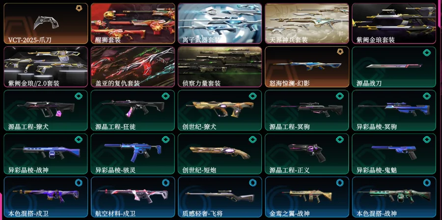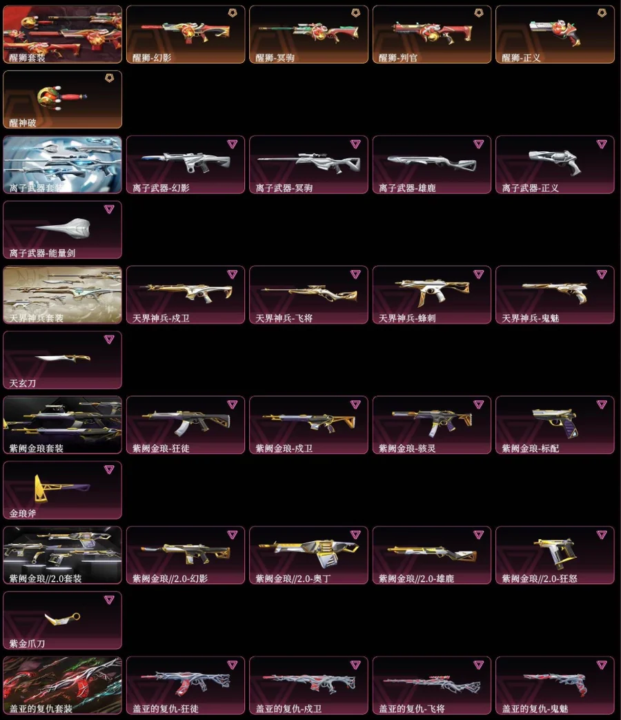 【擁有套裝】醒獅套裝(醒獅-幻影,醒獅-冥駒,醒獅-判官,醒獅-正義,醒神破)全息波普套裝(全息波普-獠犬,全息波普-奧丁,全息波普-判官,全息波普-狂怒,全息匕首)蓋亞的復仇套裝(蓋亞的復仇-狂徒,蓋亞的復仇-戍衛,蓋亞的復仇-飛將,蓋亞的復仇-鬼魅,蓋亞之怒)