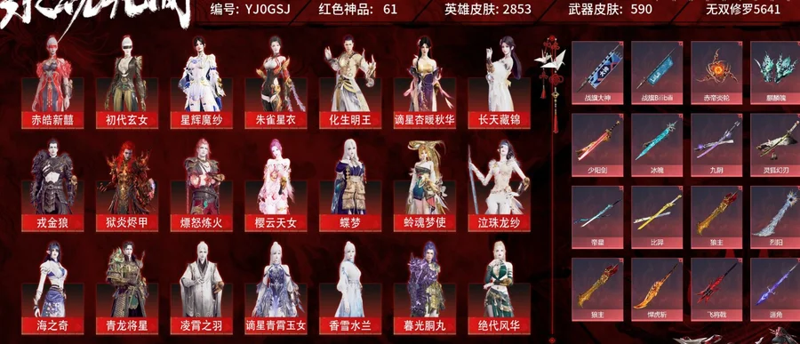 62紅色神品: 赤皓新囍/初代玄女/星輝魔紗/朱雀星衣/化生明王/長天藏錦/戎金狼/獄炎燼甲/熛怒煉火/櫻雲天女/蝶夢/人偶之夢/蛉魂夢使/泣珠龍紗/海之奇/青龍將星/淩霄之羽/香雪水蘭/暮光胴丸/絕代風華/沙漠香風/監兵兇神/夜魅遊瑩/通天狐襖/化道者/執明神君/流金曉錦/守墨麒/逐光者/畫中仙/麒麟魄/2674終極型/冰魄_/少陽劍/2674終極型紅/2674終極型紫/2674九陰/太玄之刃/靈狐幻刃/帝星/比羿/烈陽_/狼主/龍雀/悍虎斬/飛將戟/涯角/靈犀/如意金箍棒/天瓊/逆晦朔/錦鯉玉扇/狂龍/鳳求凰/詭月幽薔/驚百裏/赤帝炎輪/天罰/蒼穹之光/畢方/墨離/初櫻綺夢發