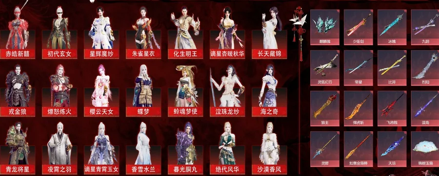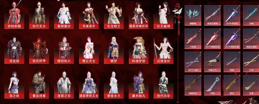 63紅色神品: 赤皓新囍/初代玄女/星輝魔紗/朱雀星衣/化生明王/謫星杏暖秋華/長天藏錦/戎金狼/獄炎燼甲/熛怒煉火/櫻雲天女/蝶夢/蛉魂夢使/泣珠龍紗/海之奇/青龍將星/淩霄之羽/謫星青霄玉女/香雪水蘭/暮光胴丸/絕代風華/沙漠香風/監兵兇神/謫星疊玉綺紗/夜魅遊瑩/謫星通天狐襖/通天狐襖/化道者/執明神君/流金曉錦/守墨麒/逐光者/畫中仙/麒麟魄/謫星花重錦/2674終極型/冰魄_/少陽劍/2674終極型紅/2674終極型紫/謫星引魂姬/2674九陰/靈狐幻刃/帝星/比羿/謫星狼主/烈陽_/狼主/龍雀/悍虎斬/飛將戟/謫星天流星輝/涯角/靈犀/謫星扶桑劫/如意金箍棒/天瓊/逆晦朔/錦鯉玉扇/狂龍/鳳求凰/詭月幽薔/驚百裏/赤帝炎輪/天罰/蒼穹之光/畢方/墨離/緋羽流風發/炎魄焚心發/初櫻綺夢發/棠華映露發