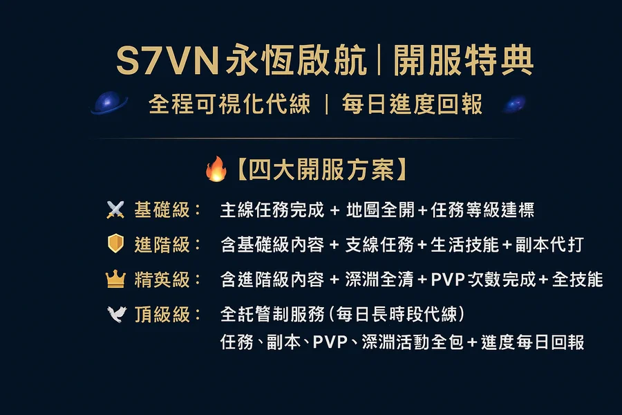 :每天8-12小時的代練服務,全面處理所有任務與副本。