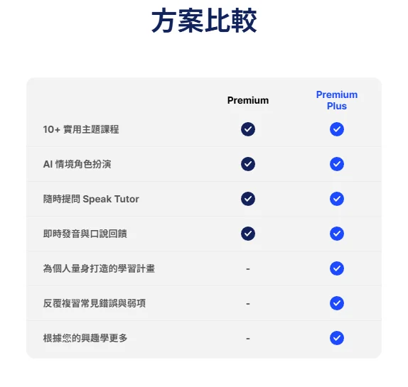 Speak AI Plus 方案 (適合需要核心口說訓練與穩定學習週期的使用者)