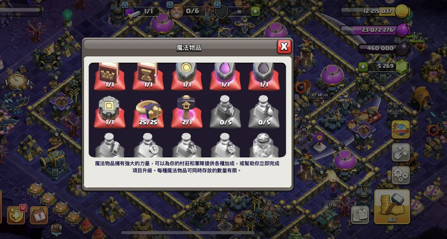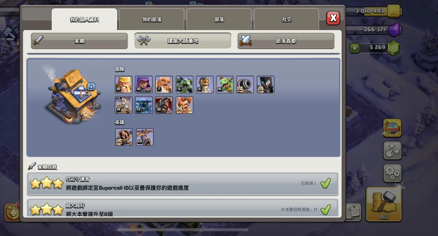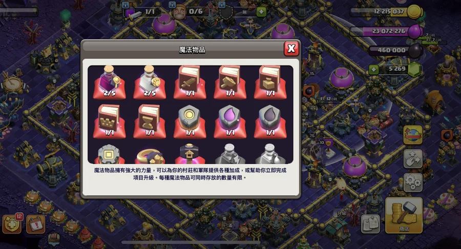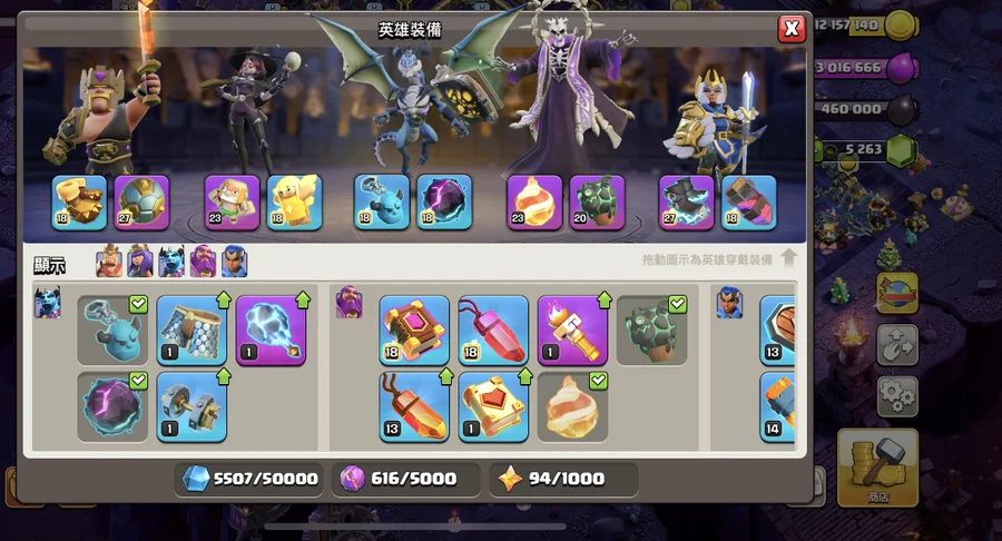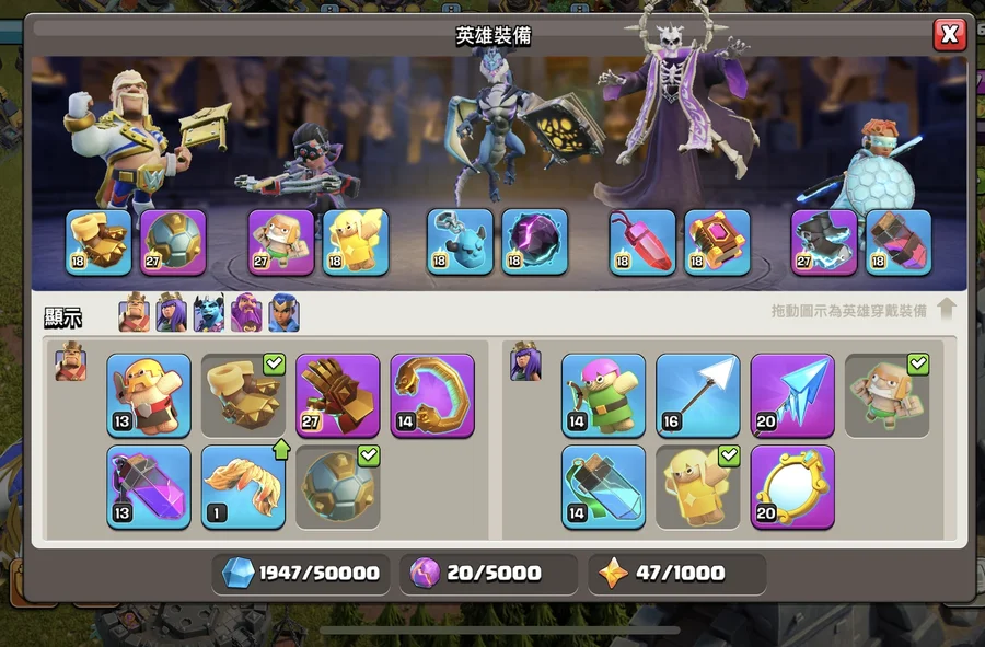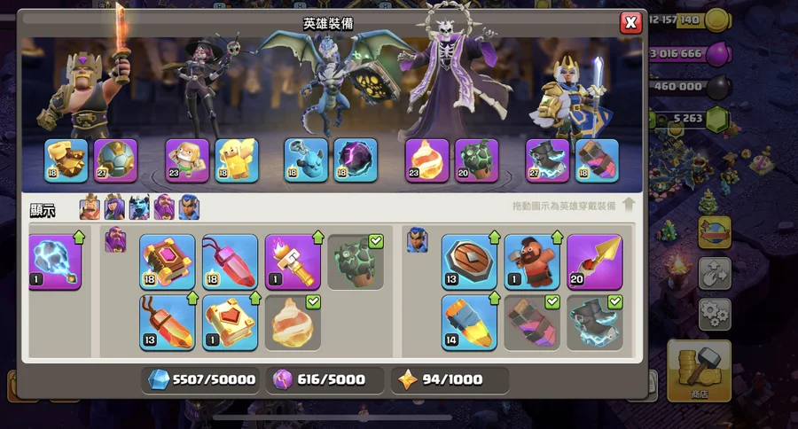 防禦全滿,兵種全滿,王全滿,裝備大多都很高等。大部分造形都有買,唯一缺點是夜世界沒什麼經營,但有買造型 ,造型大部分都有了,花了很多錢,有6000積分 700多聯盟幣給你使用,會持續遊玩。(巨人裝備已升至27等,請看最後一張圖)