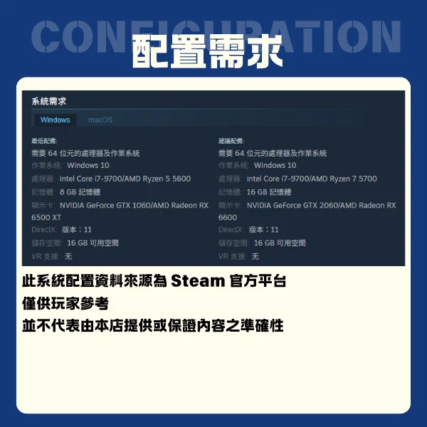 ※系統配置資訊取自 Steam,僅供參考,本店不提供該內容或技術支援。