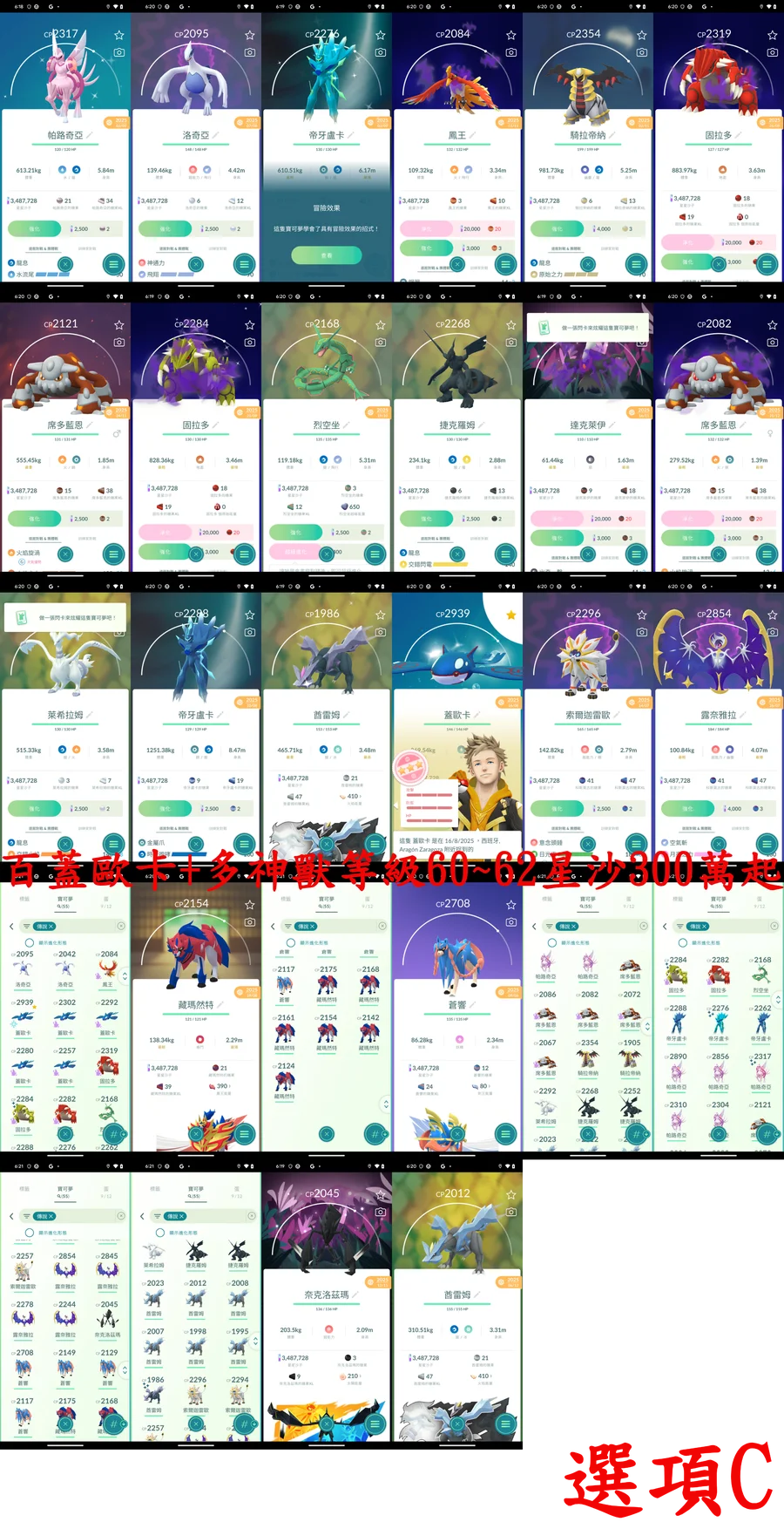 選項C 百神帳 年前特價出清 售價:800T 主打 滿百蓋歐卡 隨機出貨 等級61~63 星沙300W起 保底神獸: 索爾迦雷歐+露奈雅拉+異色帝牙盧卡+異色帕路奇亞(以上四隻保證100%有) 其餘可能出現神獸 如圖 |