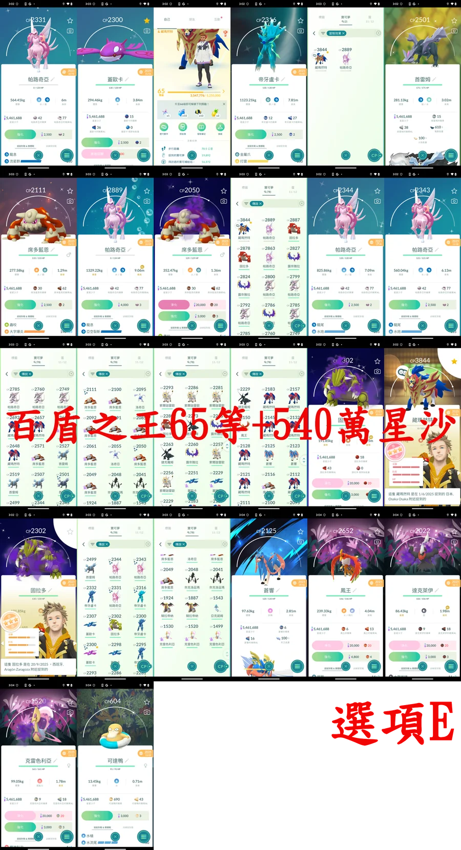 (選項E)!!!!!熱門項目 !!!!! 等級65 星沙540W 實際內容依照圖片為主 內含 滿百四星盾之王+異色黑列空坐+異色特招雙龍 盾之王-*冒險技能 讓團體戰+極巨對戰 寶可夢防禦提升 ***5000沙+6顆小糖可以使用6分鐘