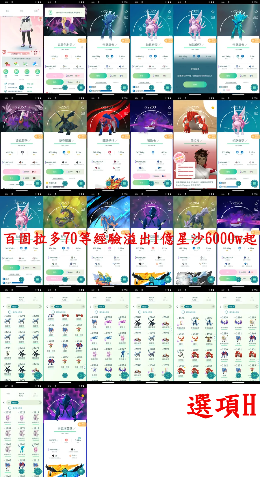 (選項H) 百神帳+溢出經驗值+大量星沙 角色70等(經驗值溢出1億) 星沙6000W起 主打滿百四星固拉多+異色奈克洛茲瑪體型XXL 其餘看圖