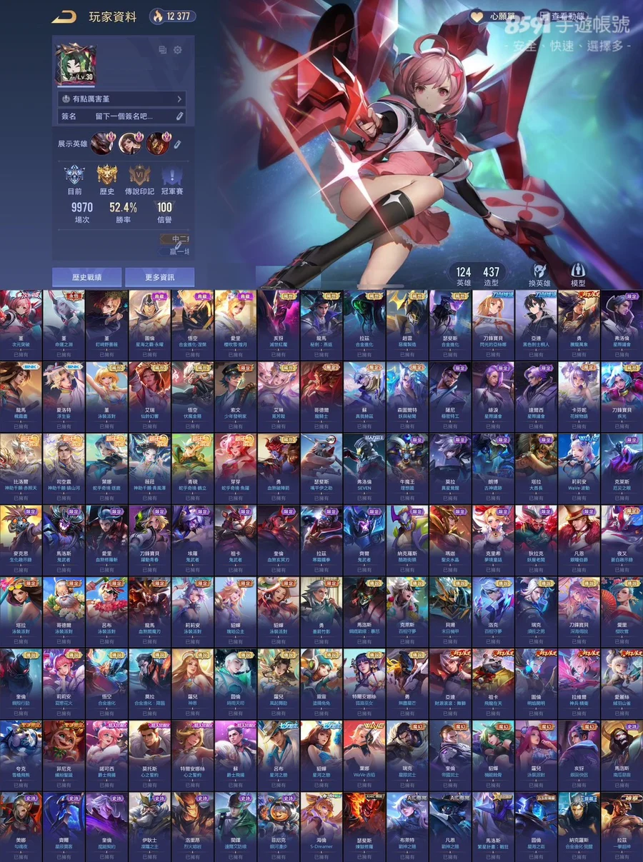 歷史絕世傳說印記!!全英雄四百多造型!共124英雄437造型!勝率近53%!!共6次S戰場傳說印記!!常用奧義皆已齊全!!多課金抽獎造型!