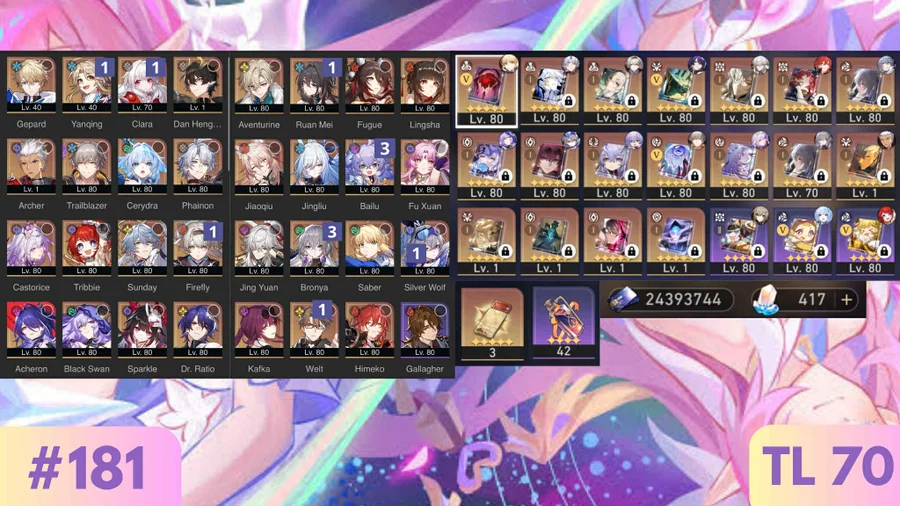 【男、70等、41金角、30金專】✅1命流螢+瑕蝶+黑天鵝+卡芙卡+白厄+景元皆專武_緹寶_刻律_黃泉_砂金_符玄