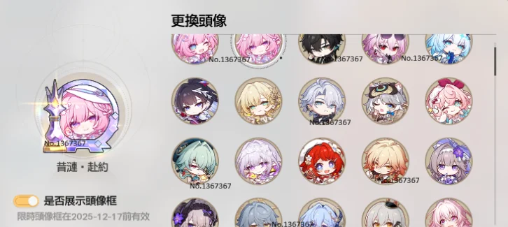大月卡頭像:知更鳥、星期日、白厄、阿格萊雅、賽飛兒、風堇、那刻夏、遐蝶、大黑塔、小黑塔、萬敵、緹寶、刻律德菈、海瑟音(9/11新增)、長夜月+騰荒(10/26新增)、大小昔漣(11/6新增)等