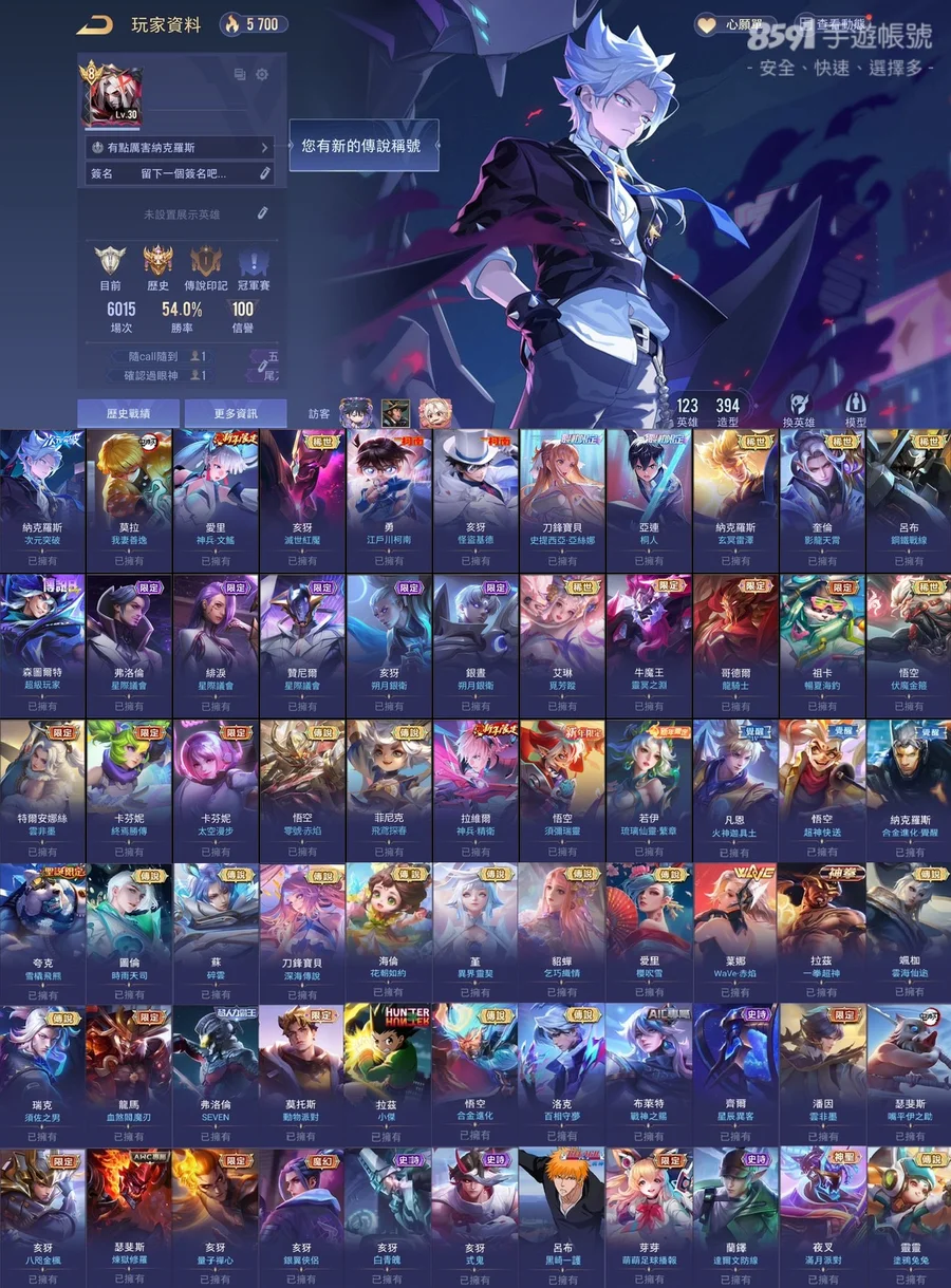 勝率佳!!全英雄近四百造型!共123英雄394造型!勝率54%!!共1次S戰場傳說印記!!常用奧義皆已齊全!!多課金抽獎造型!