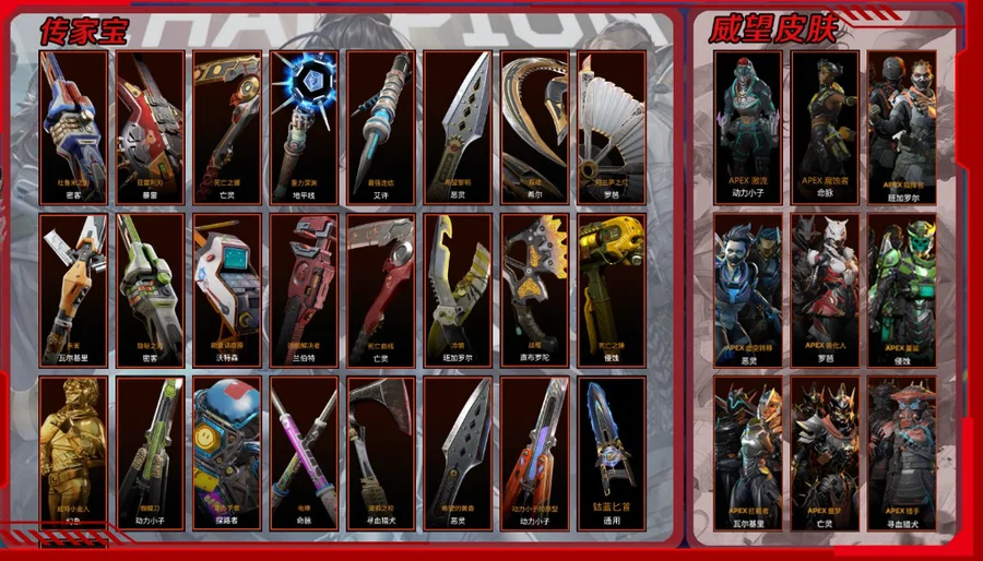 【威望皮】APEX偶像/APEX男神/APEX虛空蛇/APEX機甲/APEX腐蝕者/APEX激流/APEX獸化人/APEX噩夢/APEX蔓延/APEX攔截者/APEX獵手/APEX指揮官/APEX虛空轉移