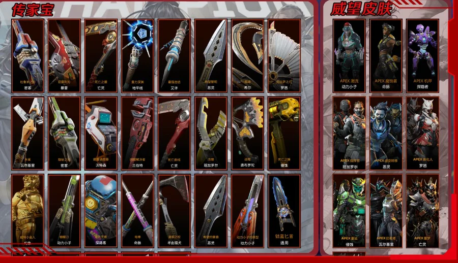 【傳家寶】動力小子-動力小子的原型 密客-杜魯米之刃 暴雷-狂霆利刃 亡靈-死亡之握 地平線-重力巨淵 艾許-最強連結 惡靈-希望黎明 希爾-雙絕 羅芭-阿蘭薩之爪 瓦爾基裏-朱雀 密客-隱秘之刃 沃特森-能量讀取 蘭伯特-問題解決者 亡靈-死亡曲線 班加羅爾-冷鋼 直布羅陀-戰棍 侵蝕-死亡之錘 幻象-威特小金人 動力小子-蝴蝶刀 探路者-拳擊手套 命脈-電棒 尋血獵犬-渡鴉之咬 惡靈-希望黃昏