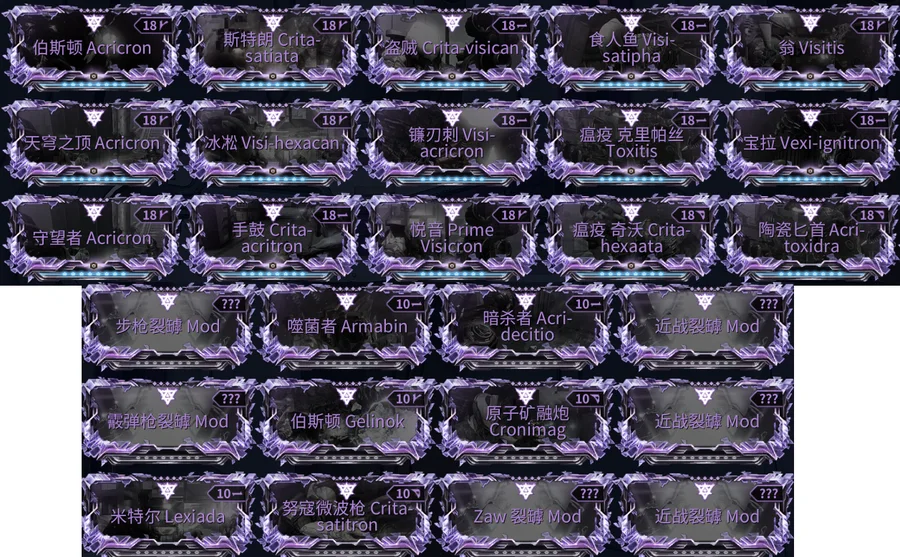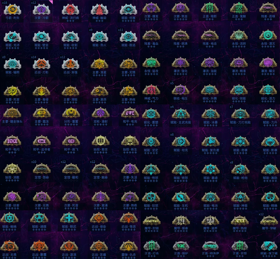 武器、戰甲、賦能、MOD基本齊全,MOD基本上常用的全升滿(執行官系列MOD、Umbra系列、Prime系列、4k系列、鍍層系列)都傳奇4了,你想的到的幾乎都有,圖截完會太多就不放了,你想知道有沒有的也可以直接來私我。