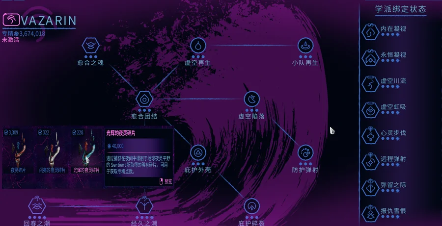 集團全部均滿等、指揮官五個學派全部滿等(以後出新的學派也可以拿夜靈碎片轉化直接升滿)、Helminth(大嘴)滿等,只差大概10個戰甲沒餵過大嘴。