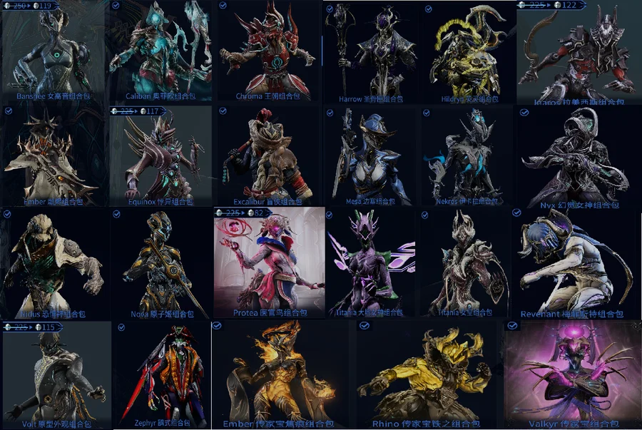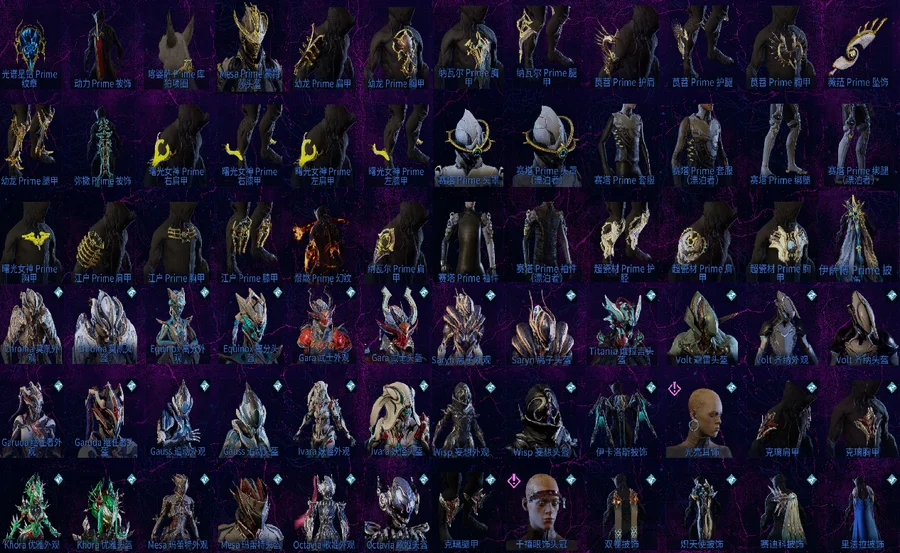 有買過2021 TennoCon和2025 TennoCon數位門票,Prime飾品看圖(Mesa Prime蒙特沙頭盔、爆燃Prime幻紋、彌撒Prime披飾)、TennoGen(工坊造型)看圖、華麗組合包看圖(若有顯示白金打折的是只有單買華麗外觀)、傳家寶整包有Valkyr、Ember、Rhino。
