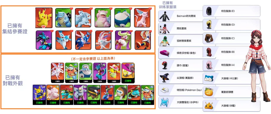 +集結證12個+已擁有對戰外觀15個以上+已擁有多個訓練家服裝+集結參賽證自選箱1個